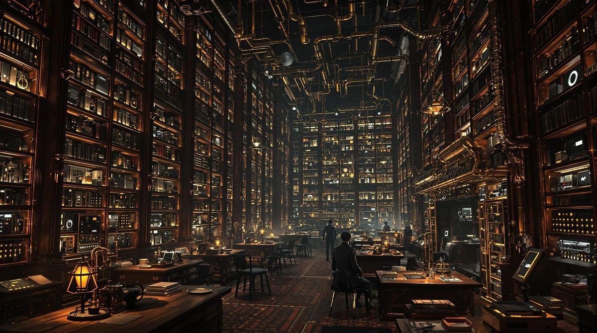 This image depicts a grand, dimly lit library blending industrial and sci-fi elements with Victorian-era charm, featuring towering shelves, brass fixtures, and vintage computer components, amidst a labyrinth of copper pipes and steam-powered lamps, evoking a sense of nostalgia and innovation.