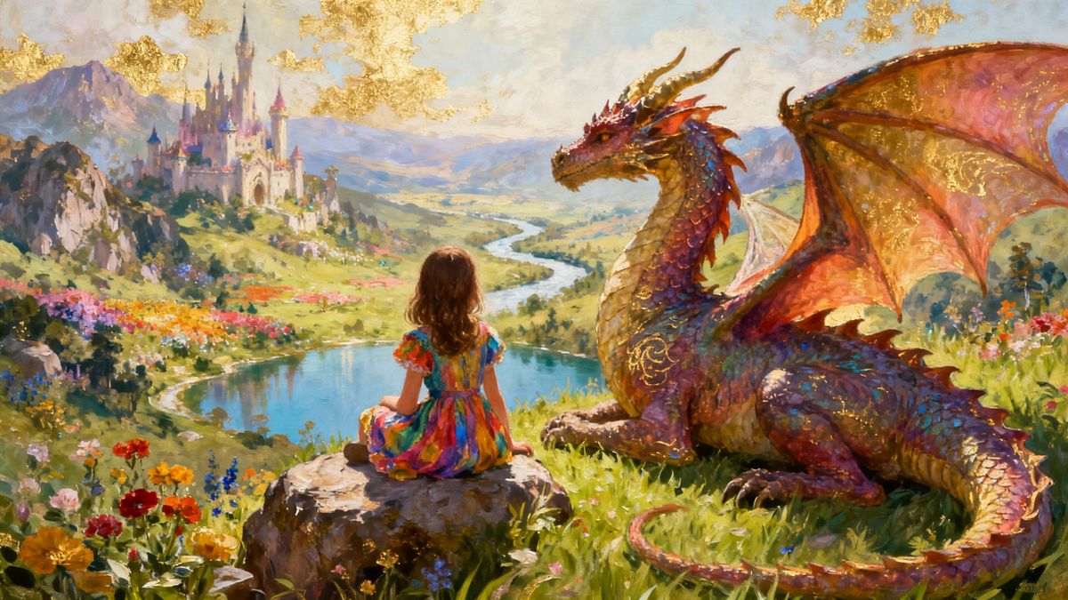This image showcases a detailed oil painting of a young girl in a colorful dress sitting with a large dragon beside a tranquil lake. The scene is set in a vibrant fantasy landscape with mountains and a castle.