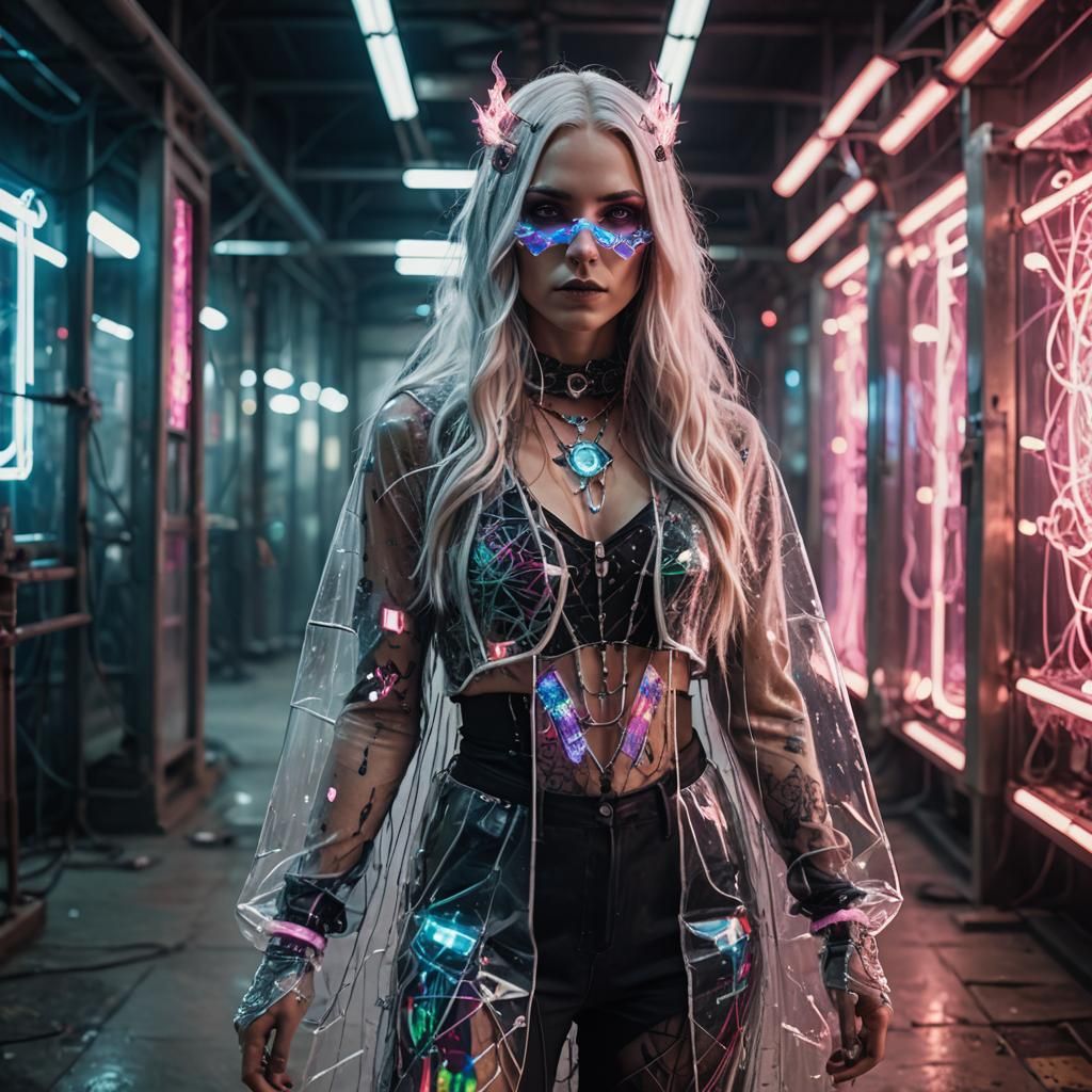 A striking picture of a beautiful, otherworldly young woman with a transparent, glass-like body. She has long, white, electric hair, crimson-pink eyes, and a tattooed face, with a cinematic aesthetic.