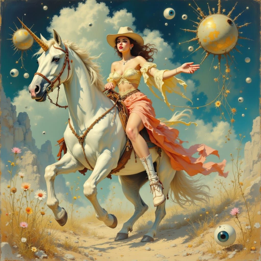 A 1950s pinup cowgirl rides a celestial unicorn through a surreal dreamscape. Inspired by surrealism and Aquarelle oils, featuring soft colors and painterly textures.