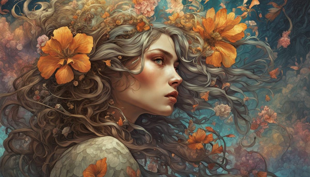 A striking picture of a young hippie woman in 1960s attire. The portrait features dynamic lighting, intricate details, and triadic colors. The artwork has a hyperdetailed, painterly aesthetic.