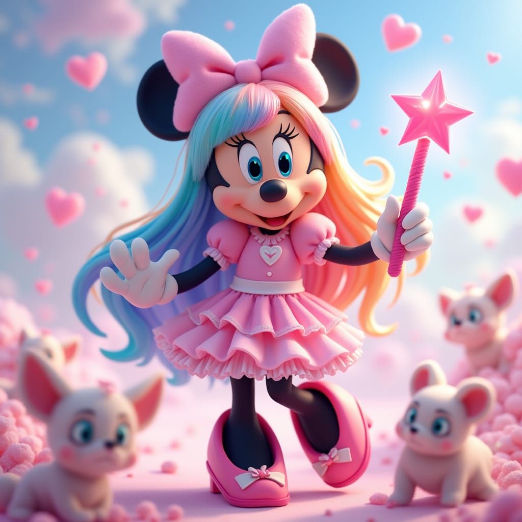 This image shows a magical girl version of Minnie Mouse in a vibrant, dreamlike world, surrounded by cute animals and floating hearts, with a focus on kawaii and magical elements, created in a 3D anime style with intricate details and ultrafine textures.