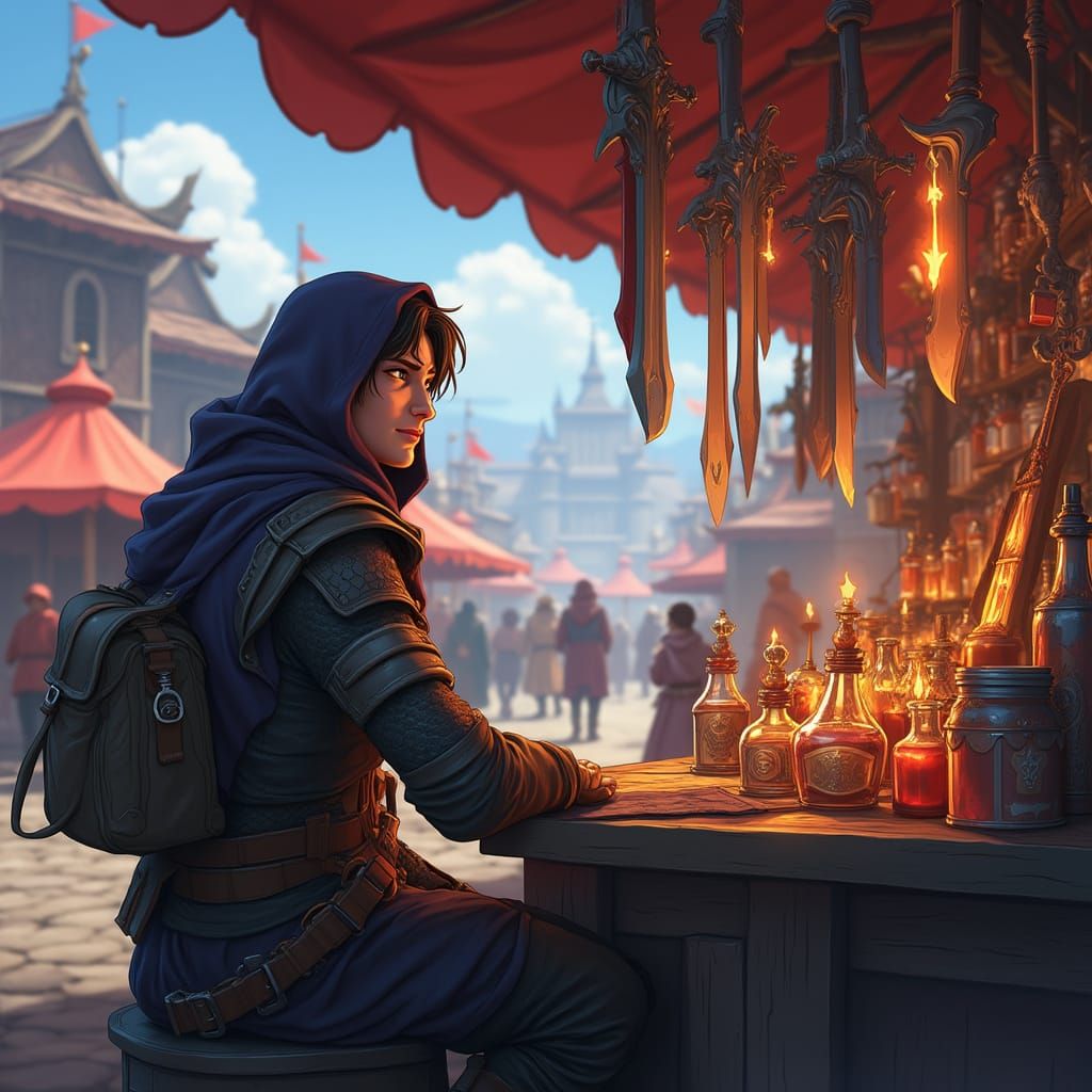 This image shows an anime-style merchant from a fantasy RPG, seated before a medieval stall brimming with magical weapons and potions. The artwork features a vibrant MMORPG town setting with dramatic lighting and cinematic quality.