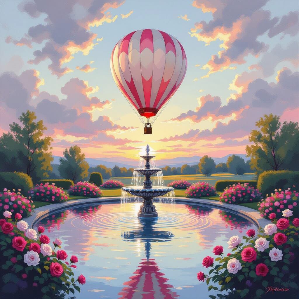 A breathtaking picture of a hot air balloon flying over a reflective pond. The pond is surrounded by pink and white roses and an ornate water fountain, all beneath a colorful sky in an impressionistic style.