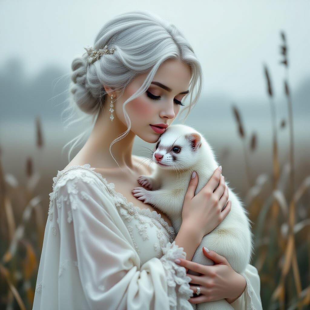 A striking picture of a pale woman with silver hair in a misty landscape, holding a white ferret. The image has a hyperrealistic, romantic surrealism aesthetic.
