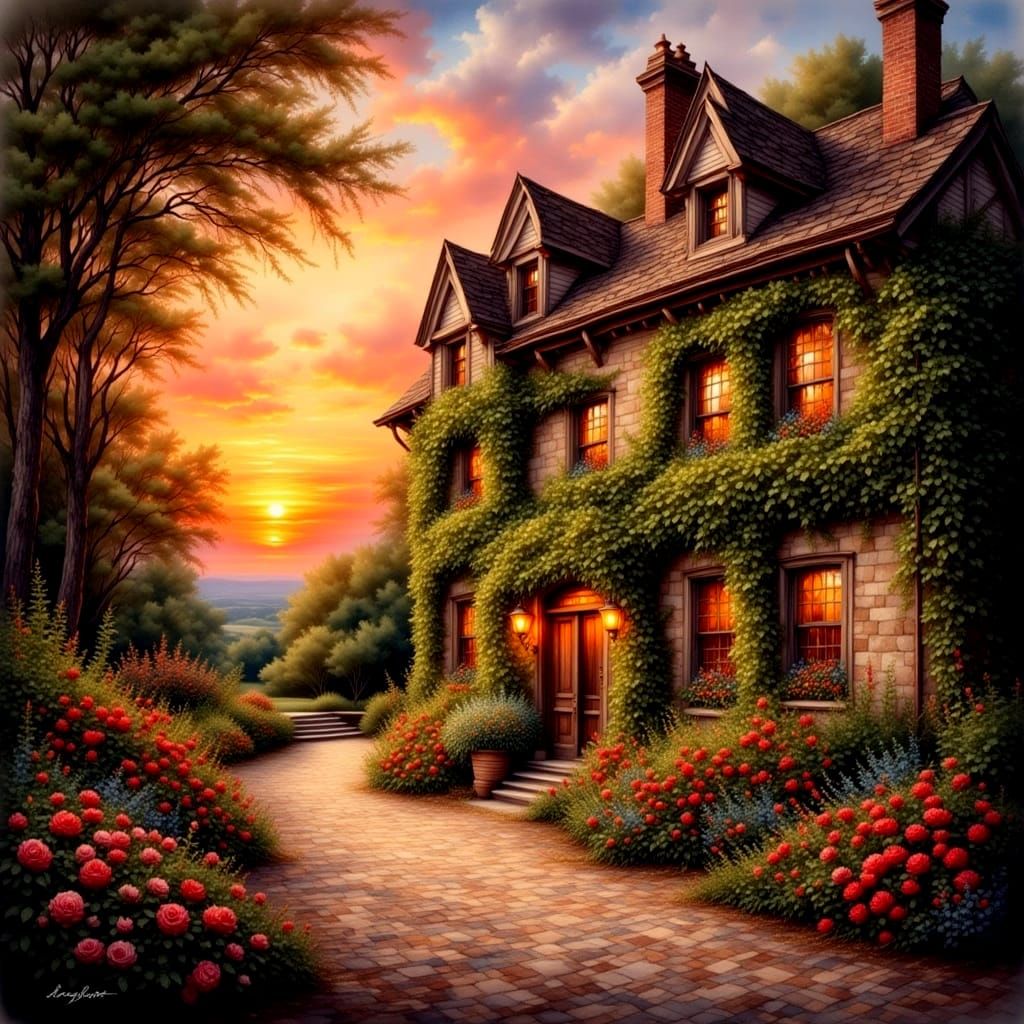 This image shows a rustic farmhouse covered in climbing roses and ivy, illuminated by a fiery sunset. The artwork is reminiscent of antique watercolor paintings.