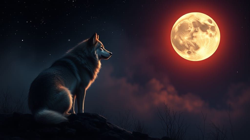 This image shows a majestic wolf silhouetted against a vibrant moonlit landscape. The scene features deep colors and a sky filled with stars, creating a surreal and captivating digital artwork.