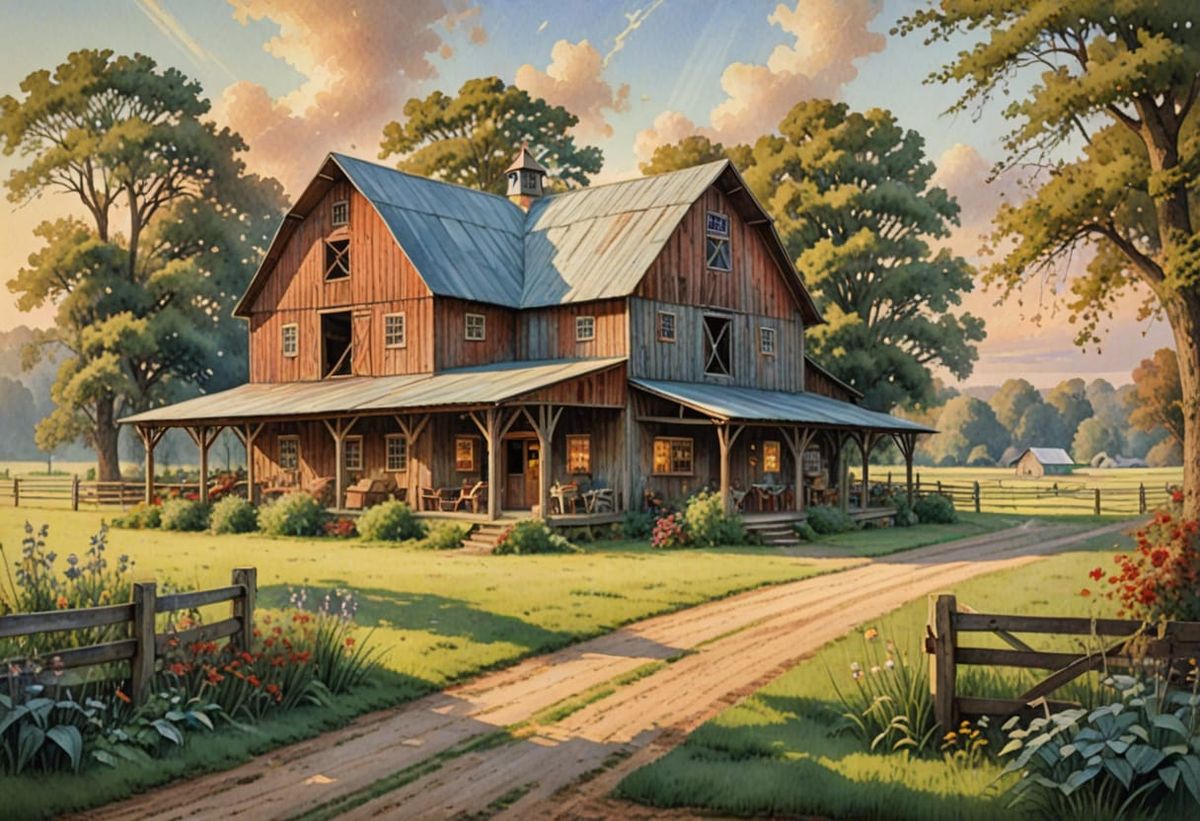 This image shows a serene rustic barn near a charming farmhouse with a porch, bathed in the warm light of late afternoon, rendered in a fine-tuned stylized watercolor aesthetic