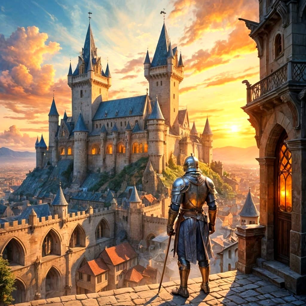 This image shows a knight silhouetted against a medieval city at sunset. The picture uses soft lighting and pastel colors to create a whimsical fantasy scene as a watercolor painting.