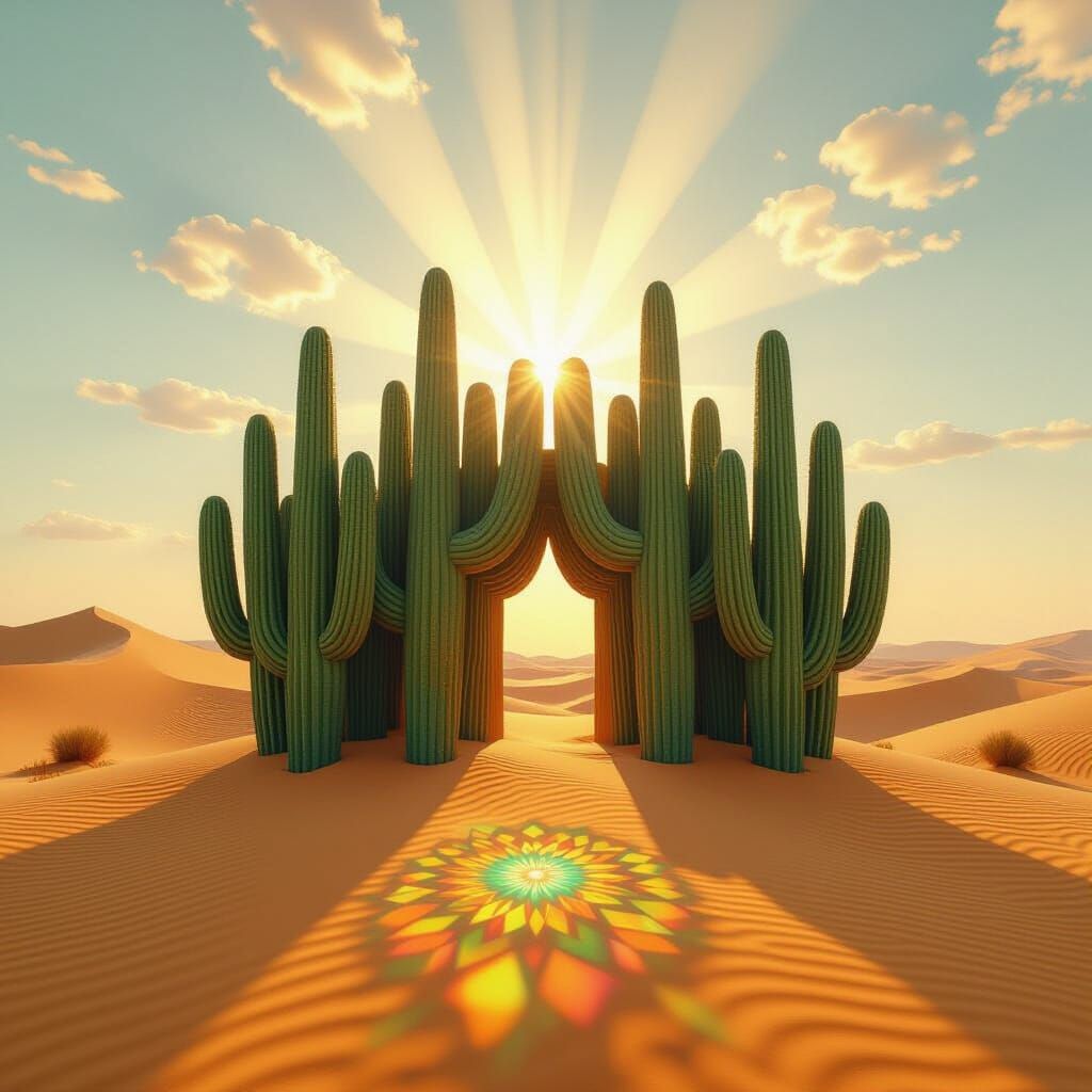 This image depicts a vast cactus temple sculpted from sand dunes, featuring emerald ribs and stained-glass thorns. Sunlight creates fractal patterns, evoking stillness and divine endurance in a cinematic desert surrealism style.