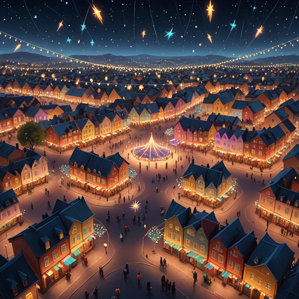 A vibrant, high-definition digital painting capturing a town square adorned with twinkling lights for Starfall Night. Features glowing lanterns and a festive, magical atmosphere.
