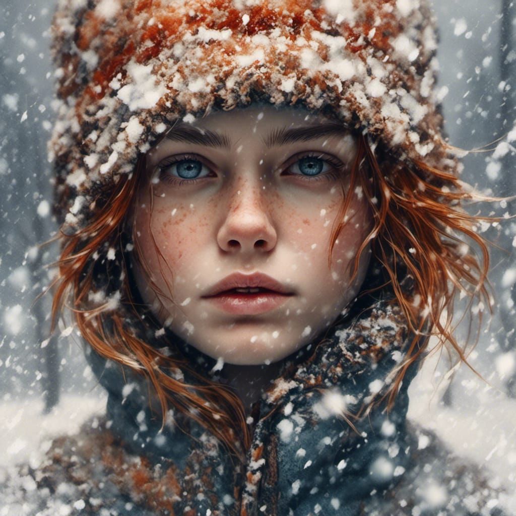 This image shows a medieval Scandinavian woman's face during a blizzard. Rendered with hyperrealism and rich detail, the artwork features painterly watercolour techniques, harmonious colors, and high contrast.
