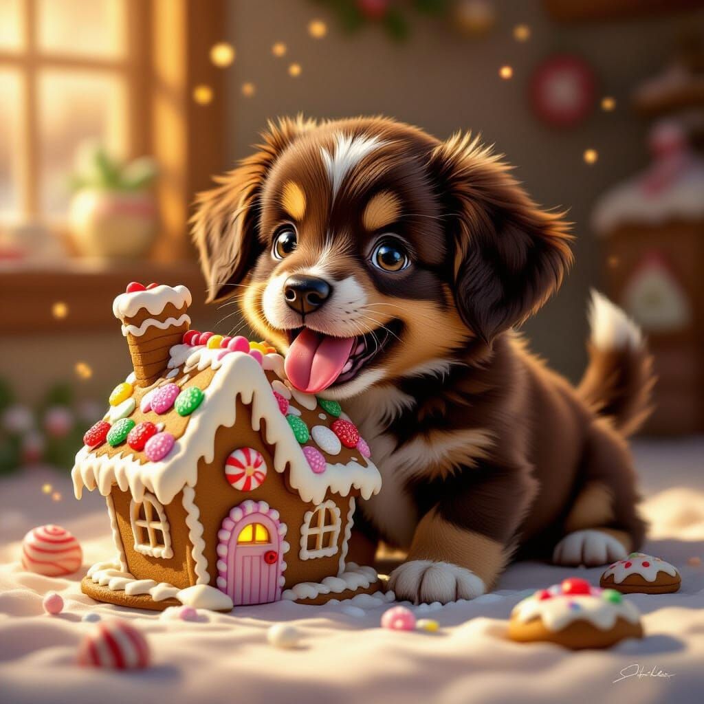 This image shows a delightful chocolate puppy happily eating a candy house, set in a cozy, fairytale scene with vibrant digital art. It features rich colors and a dreamlike focus.