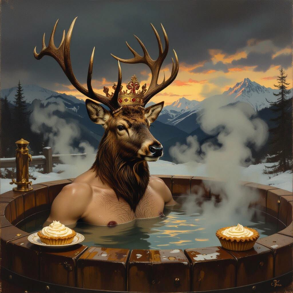 A vintage oil painting shows a stag head crowned and merged with a tanned human body in a steaming hot tub. Features include sulphur springs, mountains, and golden hour light.