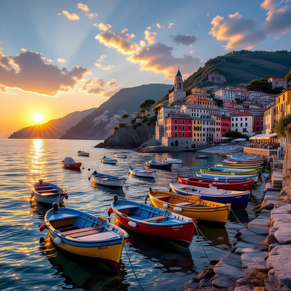This image shows a tranquil Ligurian coastline at sunrise. Colorful fishing boats rest in the harbor near an ancient stone village with weathered facades. The scene is rendered with hyperrealistic detail.