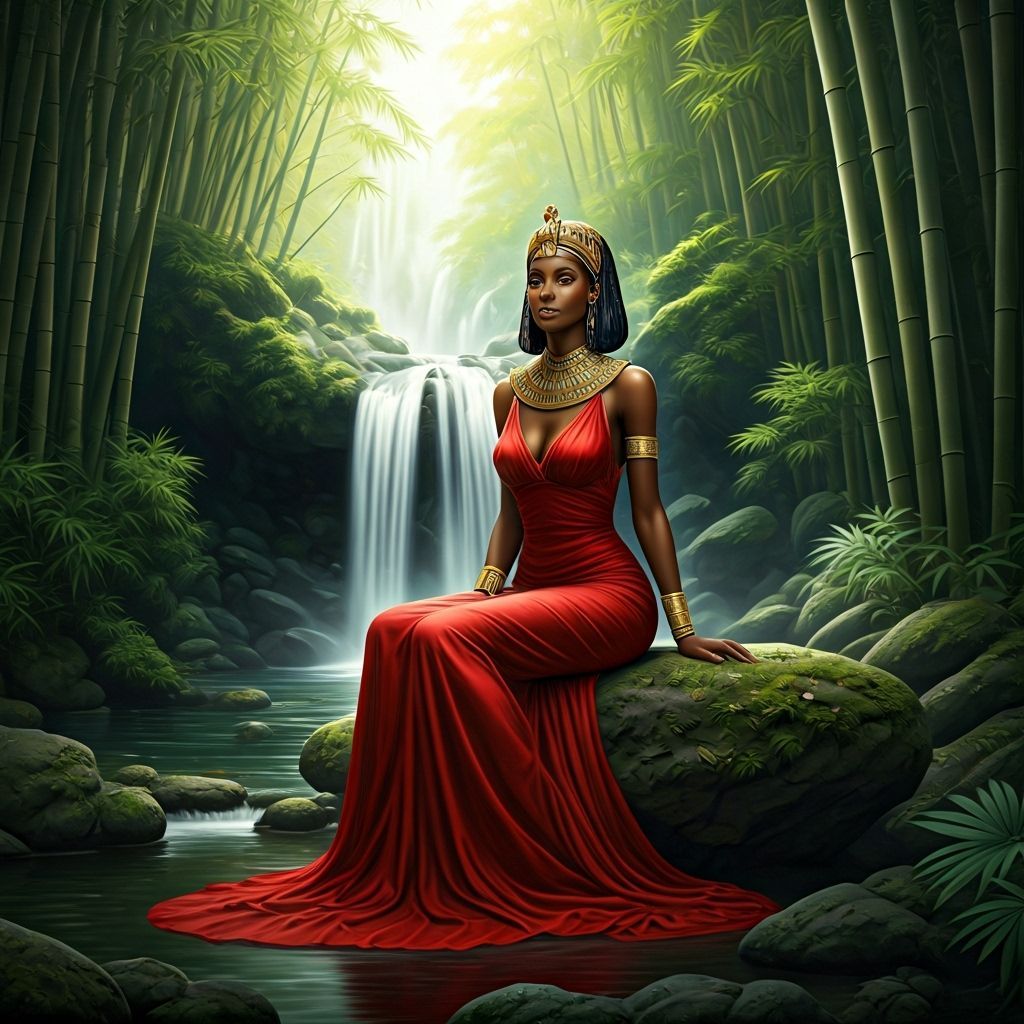 BLACK QUEEN CLEOPATRA DRESSED IN A RED EVENING DRESS SITTING ON ROCKS NEAR A WATERFALL IN A BAMBOO FOREST.