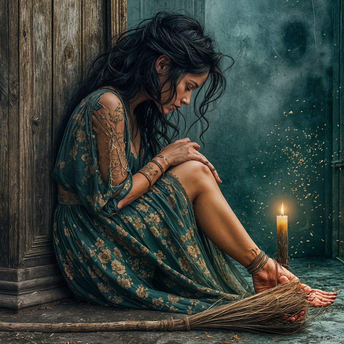 This image shows a detailed fantasy illustration of a witch with a magical broom. The scene is set in darkness, illuminated by a single candle.