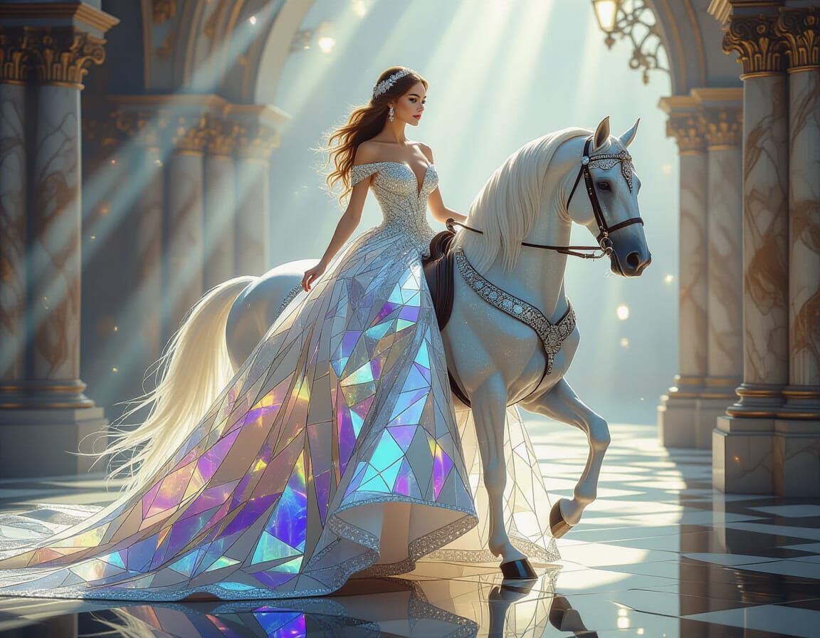 This image showcases a hyperdetailed, photorealistic portrayal of a woman in a flowing gown made of stained glass and pearls, riding a white horse. The airbrush art style features holographic shimmer and ethereal lighting.