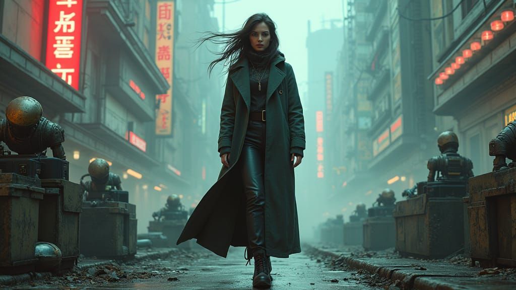 A striking picture of a woman standing in a desolate, futuristic city among discarded robots. The image is rendered in a retro-futuristic style with neon highlights and a post-apocalyptic mood.