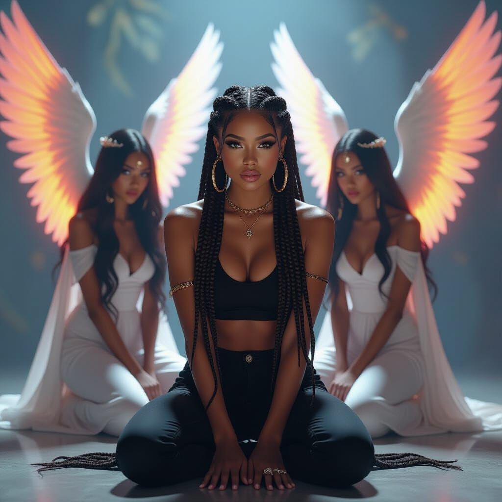 This image shows a black woman kneeling, adorned with cornrows and urban streetwear, flanked by two angels with ethereal wings in a surreal atmosphere. The image is rendered with cinematic lighting and vibrant colors.