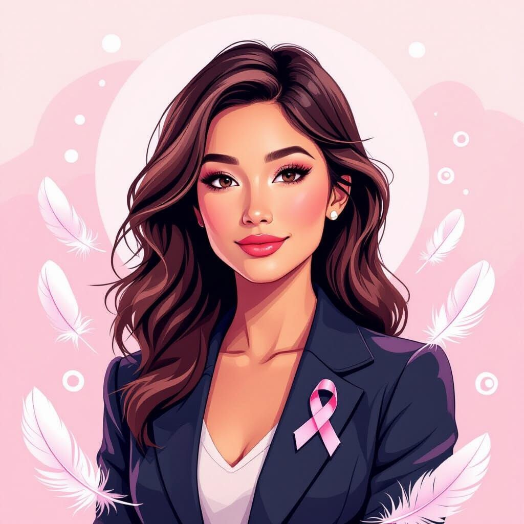 This image shows a woman with a pink ribbon pin, bathed in a soft pink light. The artwork features delicate patterns and textures, reminiscent of digital painting with watercolor elements.