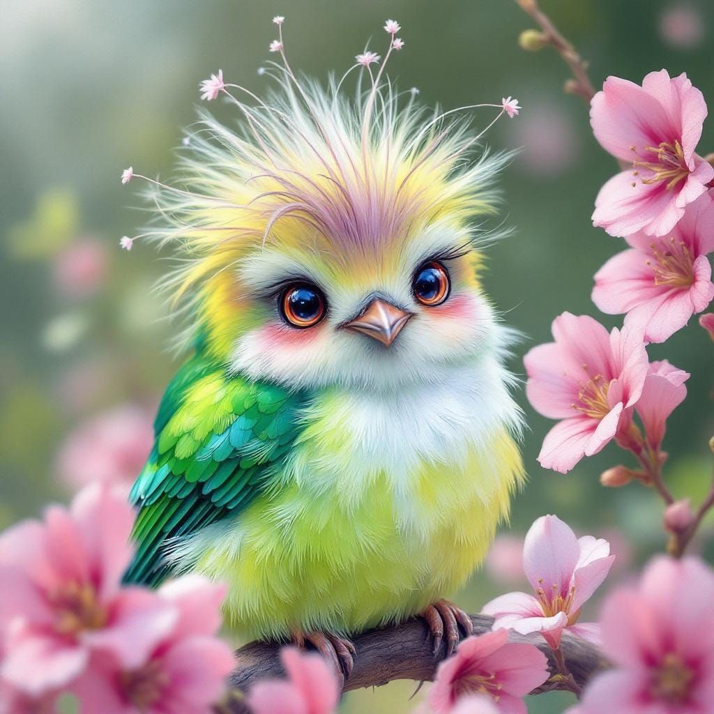 A whimsical watercolor of a metallic green woodpecker with fluffy, messy plumage surrounded by pink flowers. The artwork features intricate details and vibrant colors in a digital painting style.