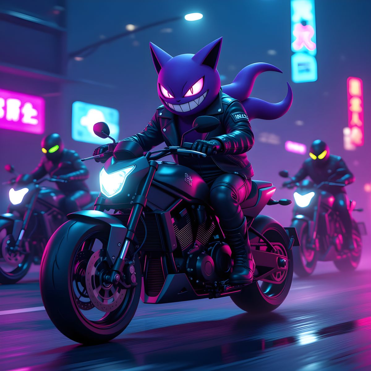 This image shows a purple Gengar, a ghost-type Pokรฉmon, riding a motorcycle with its gang. The artwork depicts a normal, wild scene with a spooky twist.