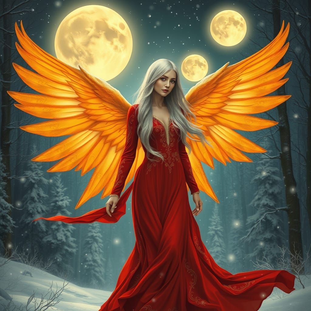 This image shows a majestic angel walking in a serene winter forest, surrounded by snowflakes and three full moons casting an otherworldly light. She wears a flowing red evening gown with golden embroidery and has majestic orange-yellow wings with delicate patterns.