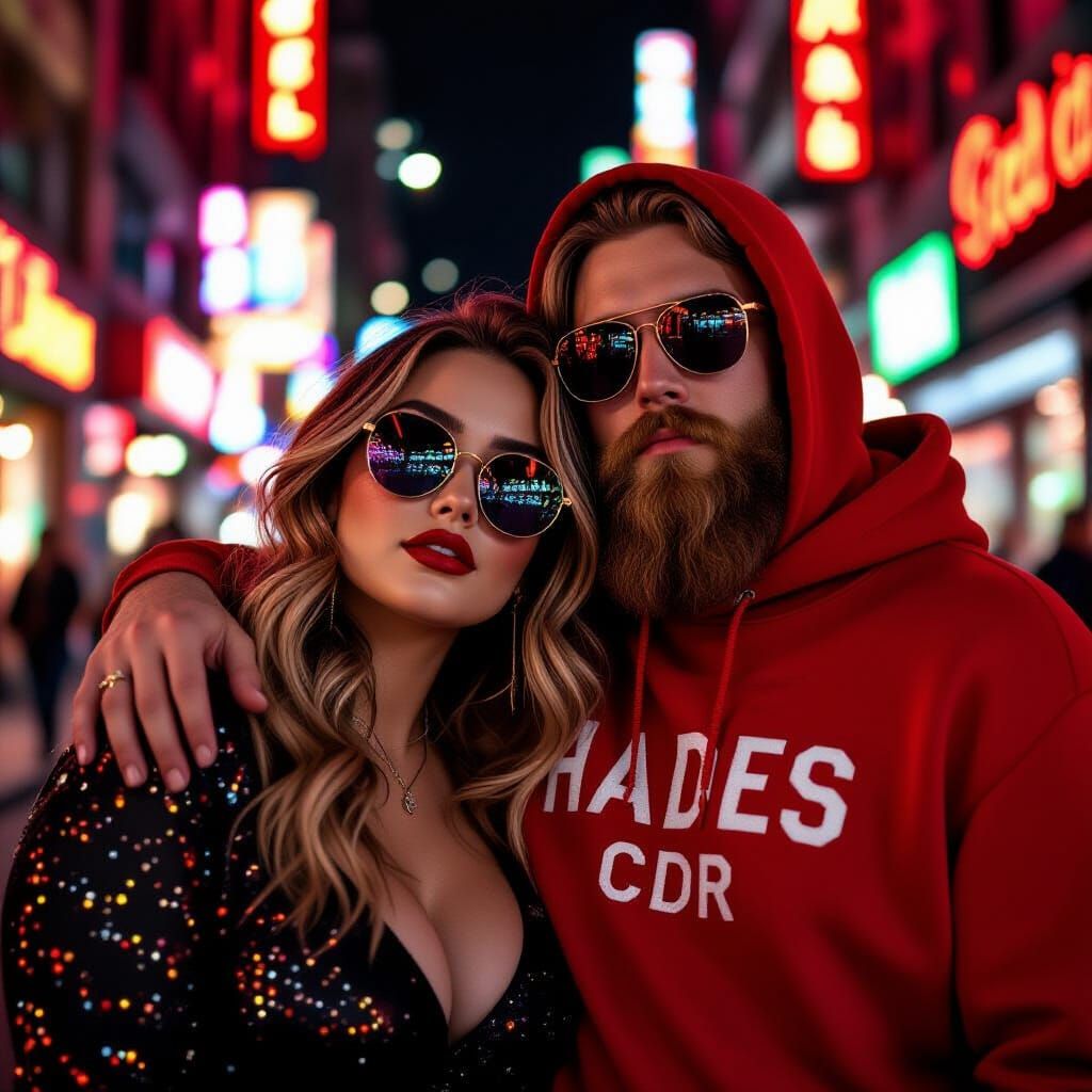 A full body portrait of a chatty Canadian Gen-Z girl with a curvy figure and sunglasses, wearing glittery black makeup and soft red lip stain, rests her head on the shoulder of a man with long red hair and a beard, donning sunglasses and a blood red sweater and hood with "HADES CDr" lettering, in a ...
