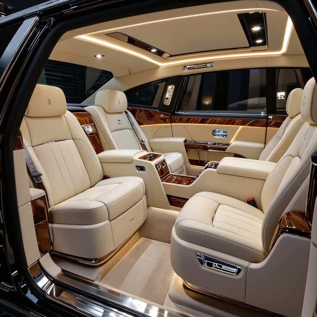 This image shows the interior of a luxurious Rolls Royce featuring cream leather seats, wooden accents and metallic trim. The spacious L-shaped bench seat accommodates three people in a blend of minimalist and vintage aesthetics.