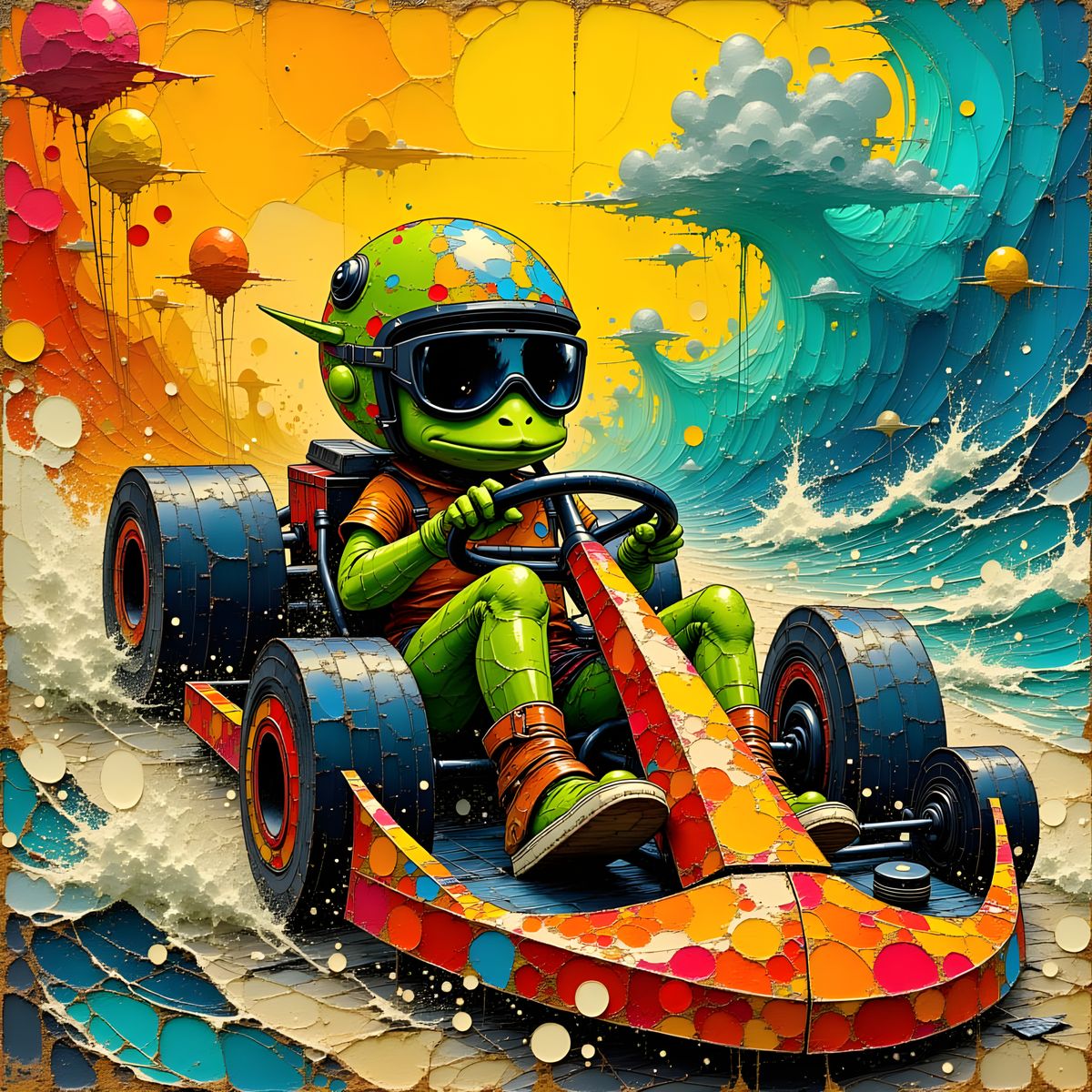This image shows Crazy Frog in a racing helmet and sunglasses, driving a kart amid chaotic scenery. The dynamic style blends playful graphics and surreal pop art.