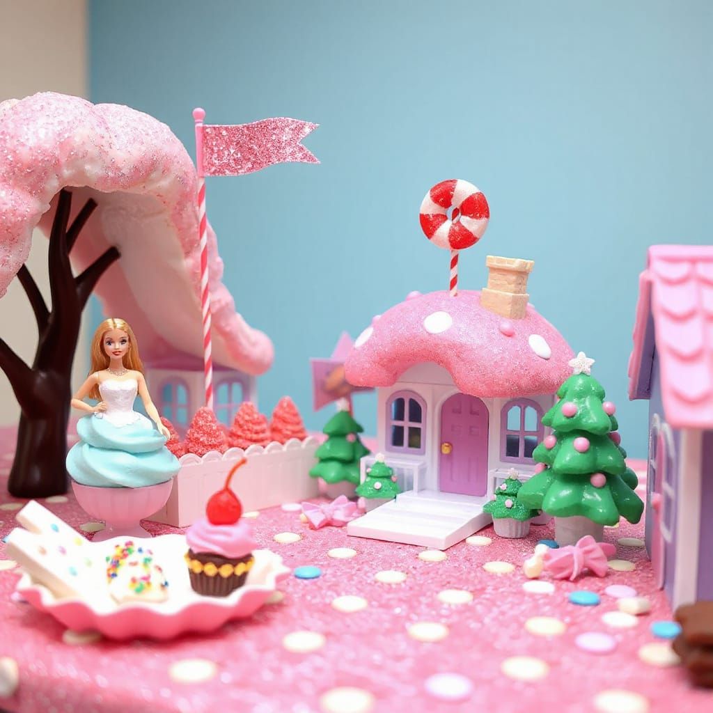 This image showcases a whimsical Barbie village made from colorful candy, chocolate, and ice cream, featuring a prominent candy cane flagpole.