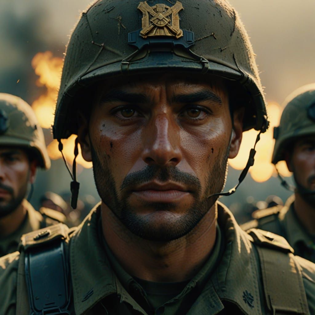 A close-up film still captures the intensity of a soldier's gaze, set against a warm golden backdrop, reminiscent of classic 35mm cinematic masterpieces