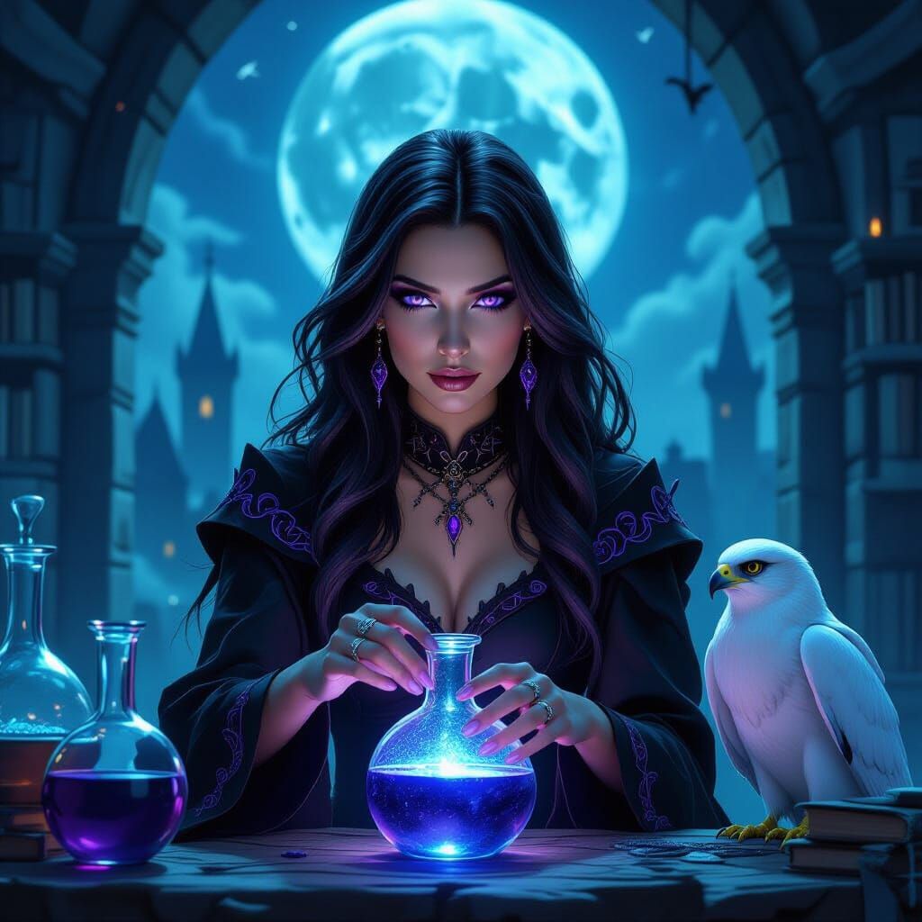 This image shows a sorceress in her tower laboratory, brewing a glowing blue potion. The scene features gothic fantasy art, dynamic lighting, and a mystical color palette.