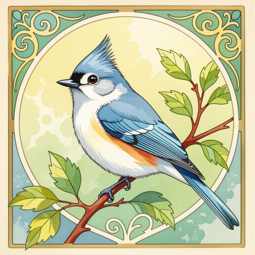 This image shows a tufted titmouse in an art nouveau style, reminiscent of a vintage watercolor postcard. The artwork evokes the elegant designs of the early 20th century.