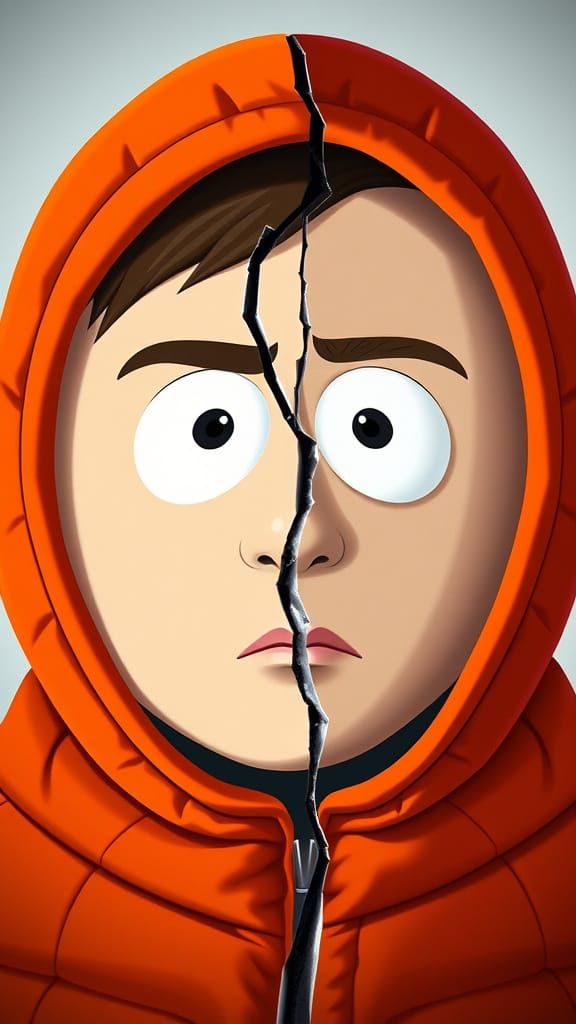 This image shows a striking portrait of Kenny McCormick, divided between fantasy and realism, with bold linework and vibrant colors on one side, and intricate textures and subtle lighting on the other, set against a soft and subdued background.