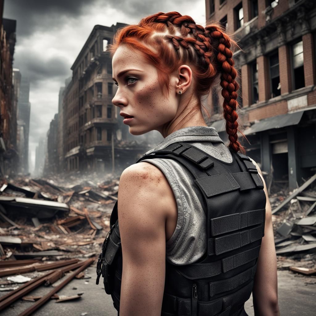This image shows a beautiful woman with auburn hair and short braids amidst a destroyed city. She wears a bulletproof vest, an essential accessory in this hyperrealistic, atmospheric scene.