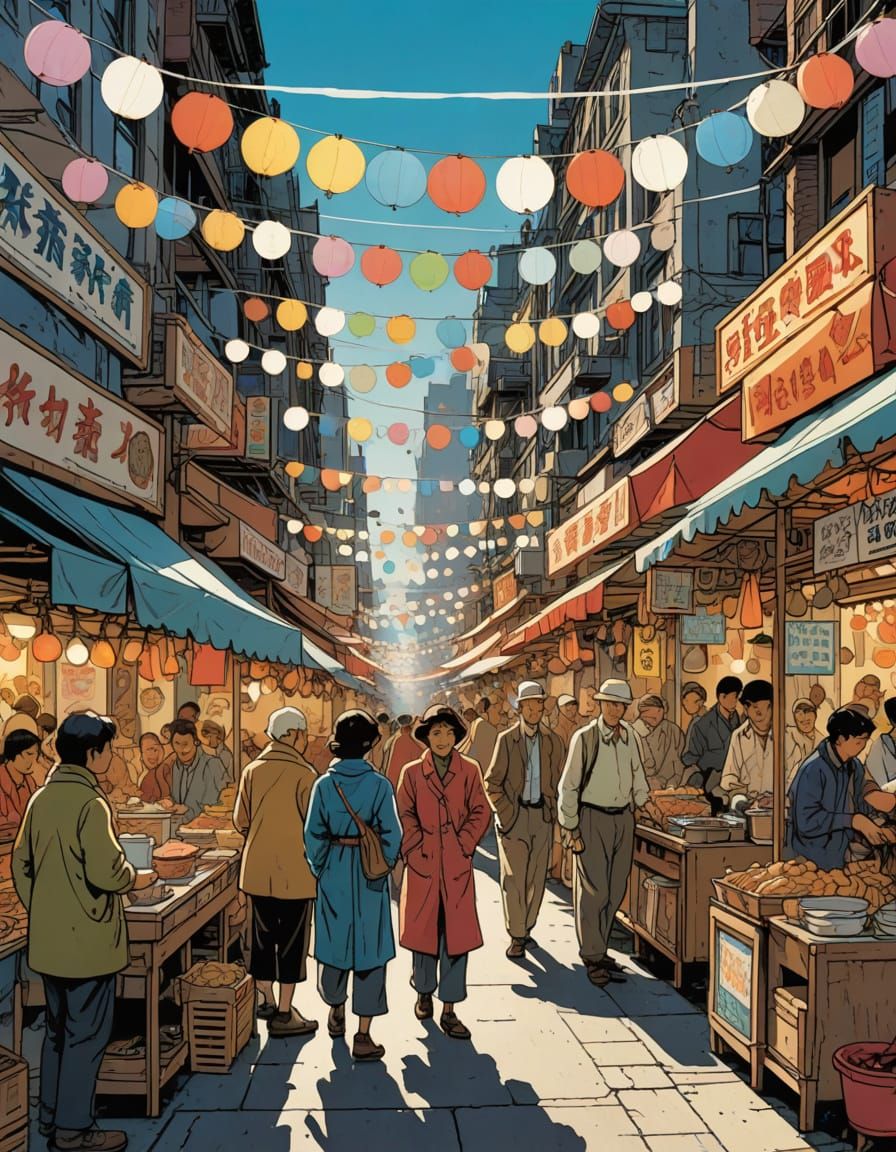 This image shows a sunlit street food market adorned with white streamers. The wide-angle shot captures the vibrant pastel colors and intricate linework in a comic book style. Golden light creates a warm, inviting atmosphere.