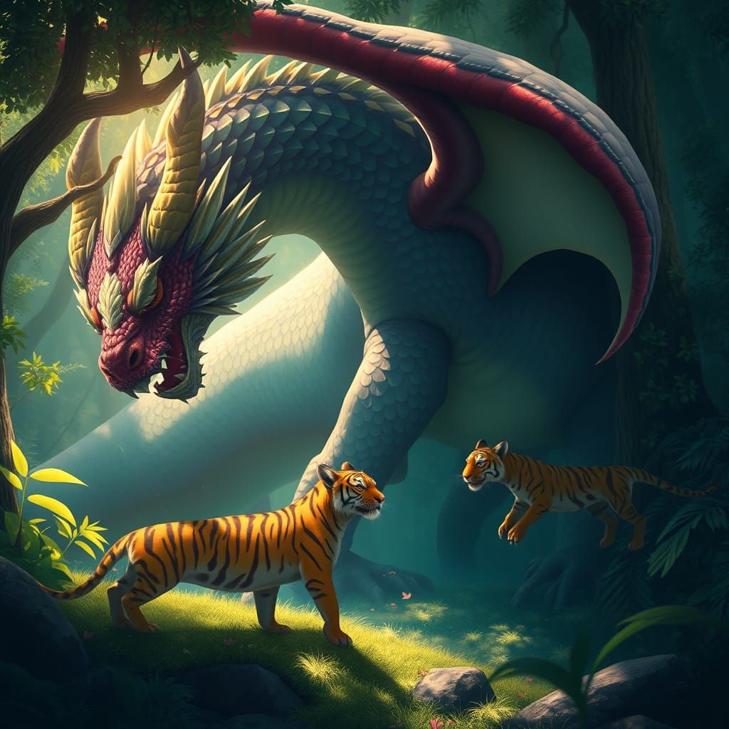 A striking picture of a large dragon with shimmering scales standing next to a small tiger in a vibrant forest. The art style evokes fantastical digital paintings.