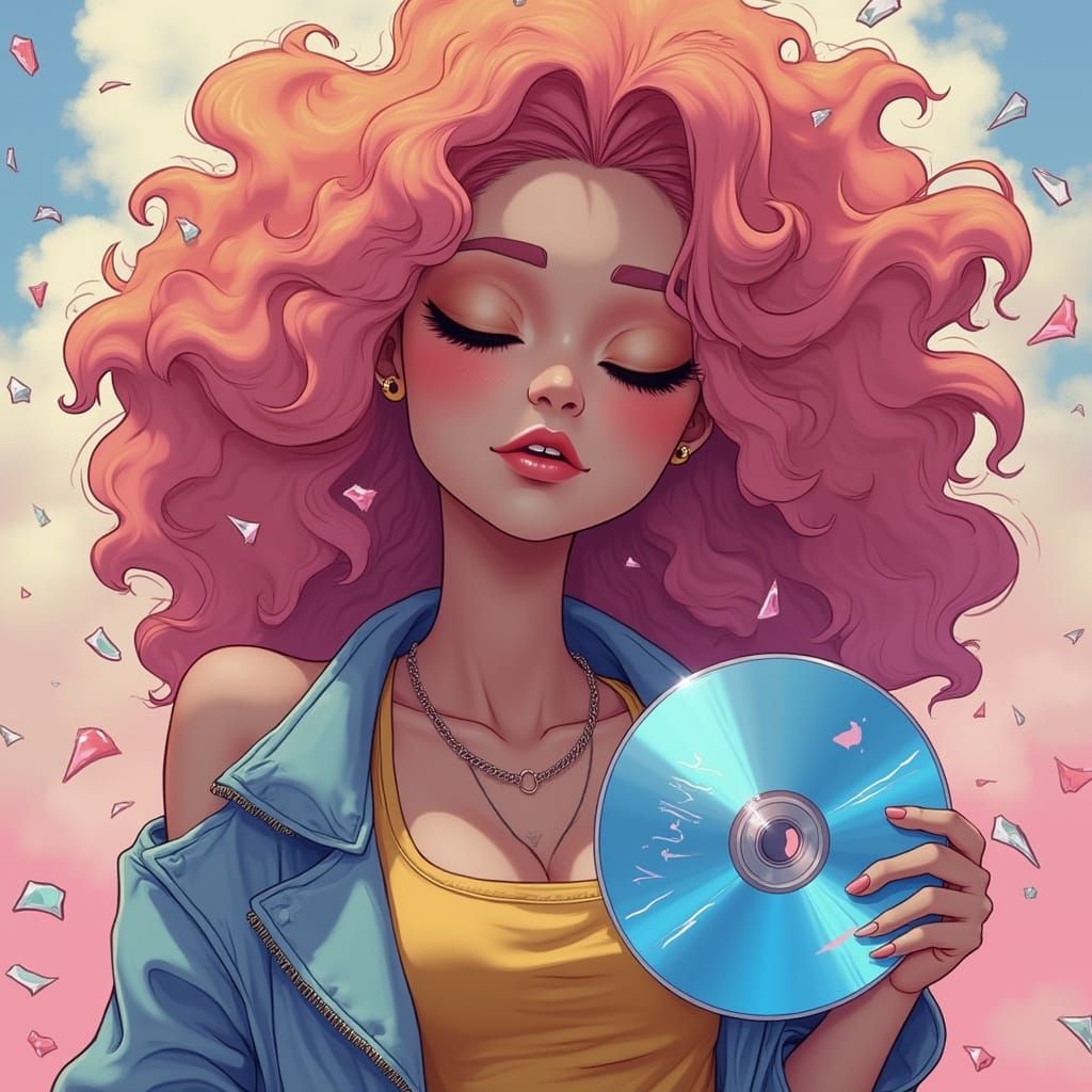 This image shows a Dominican girl with curly pink and orange hair in a vibrant anime style. She is surrounded by swirling smoke and broken mirror fragments in a dreamy, pastel aesthetic.