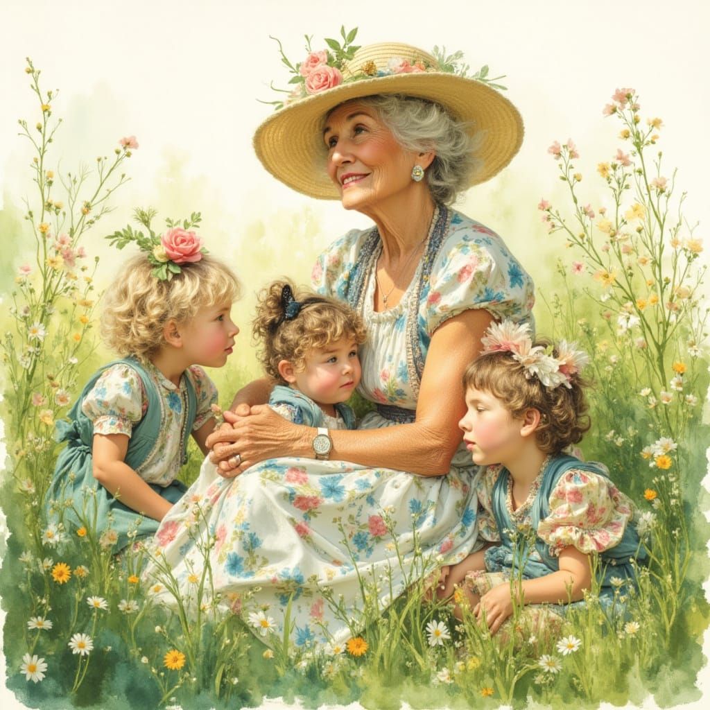A watercolour image of a grandmother in a sun hat and floral dress talking to her grandchildren in a wildflower field. The artwork features delicate colours and whimsical touches.