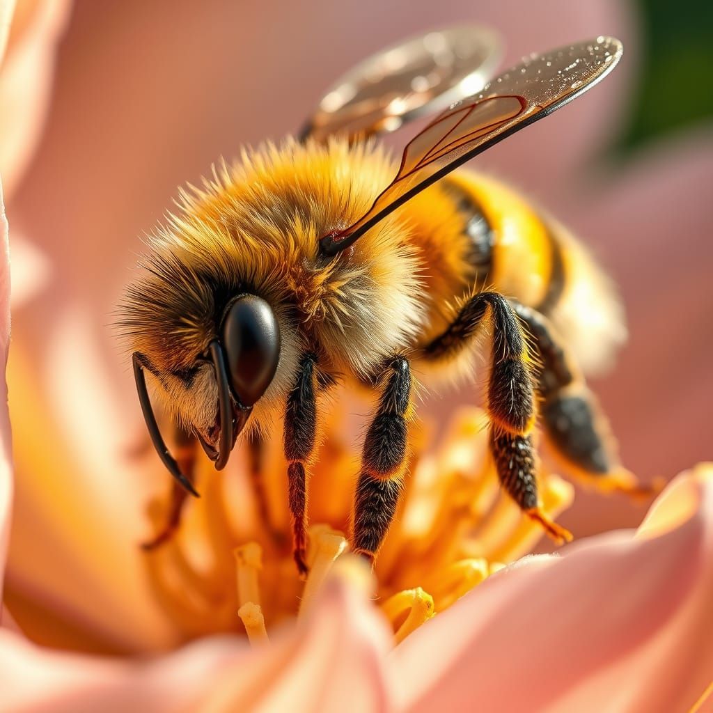 This image features a close-up of a busy honey bee surrounded by delicate flower petals, collecting pollen on the hairs of its legs in a warm, golden light, with intricate textures and patterns reminiscent of naturalistic illustrations