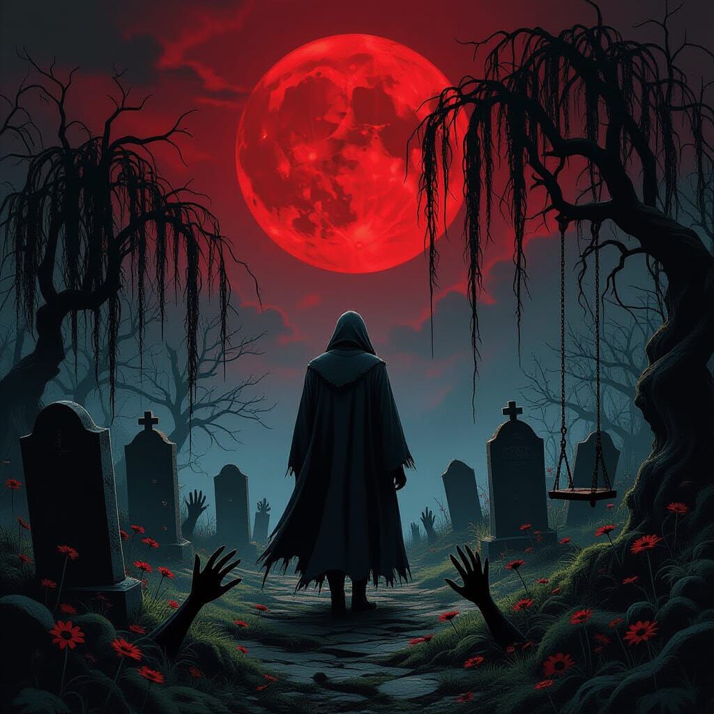 A haunting image of a lone figure in a desolate garden under a blood moon. The scene blends fantasy horror with grotesque whimsy and eerie landscapes, featuring twisted trees and grasping hands in a matte painting style.