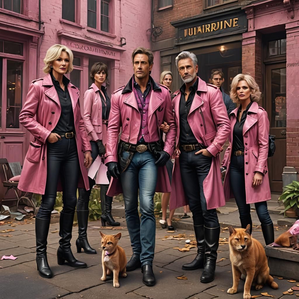 This image depicts a group of middle-aged women in jeans and boots observing a young man in a pink dress signing over his belongings, rendered as detailed matte painting with deep, complementary colors.