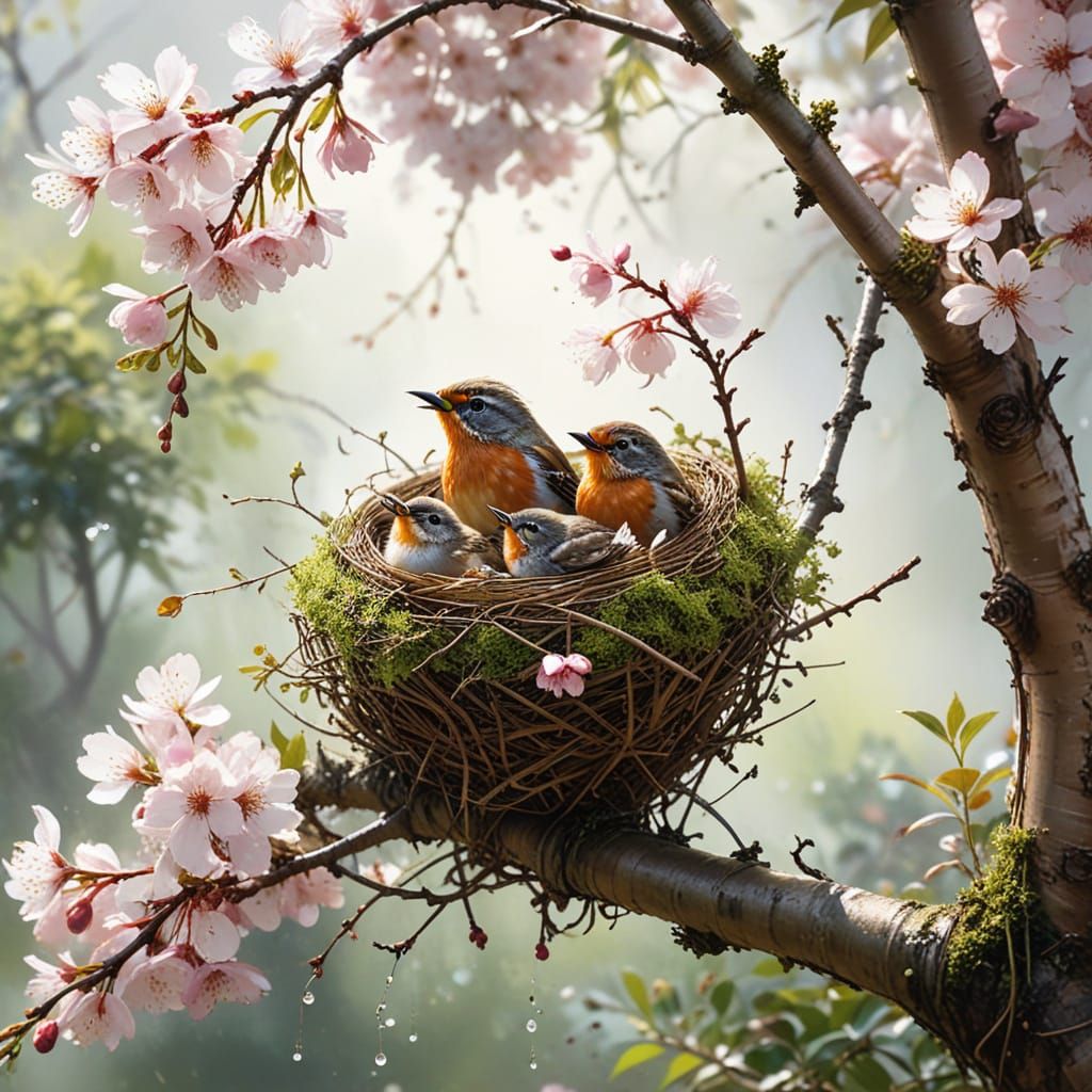This image shows a bird's nest cradled in a cherry tree, filled with baby robins being fed. The artwork evokes a watercolour painting with soft focus and vibrant yet translucent colors, capturing nature's delicate beauty.