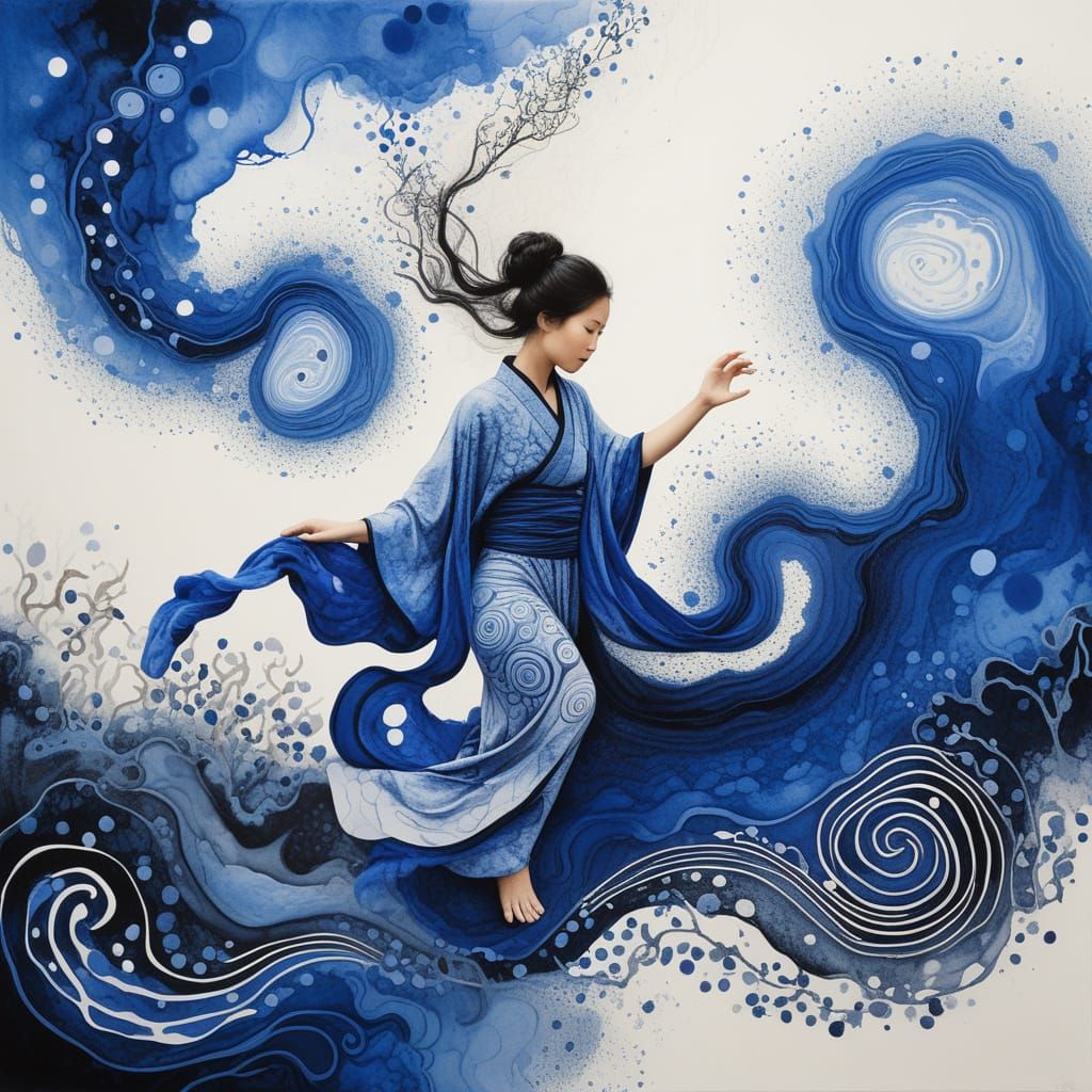 A surreal depiction of a lady in a vibrant, dreamlike universe, blending ink wash, dot art, and fluid silk painting with ethereal gradients and detailed ink strokes.