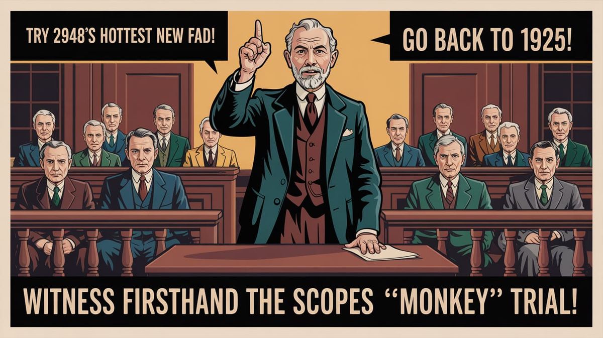 A 1950’s style Travel Poster advertising the Scopes “Monkey Trial”. The image shows a 1920’s courtroom, full of older men. Standing at the front, between the Judge’s bench and the Defedant’s table is a distinguished looking older man with a beard, wearing an old fashioned 3 piece suit. His mouth is ...
