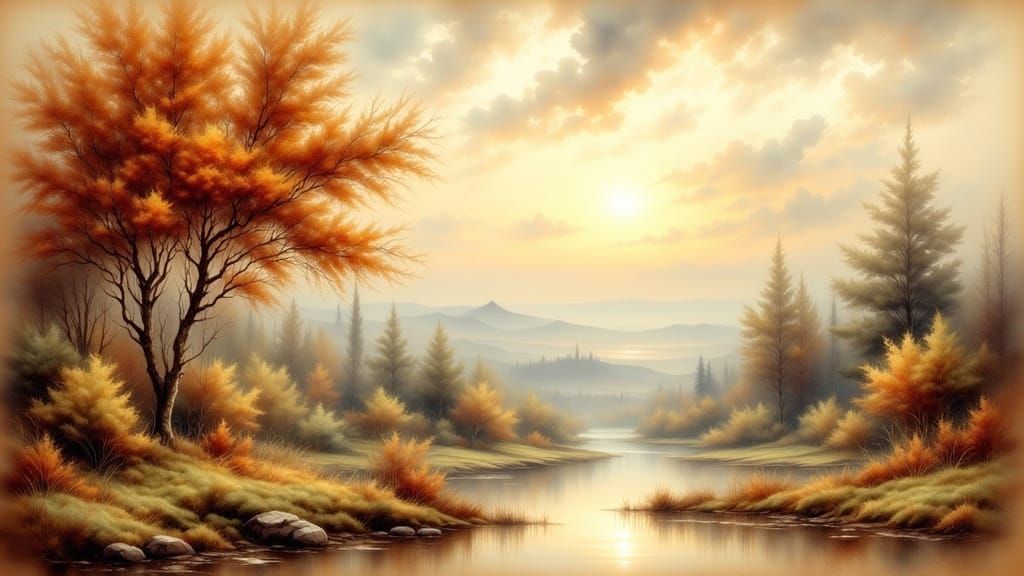 This image features a serene antique landscape with a warm, inviting color palette reminiscent of traditional watercolor art. Soft, dreamy hues evoke a sense of nostalgia and classic charm.