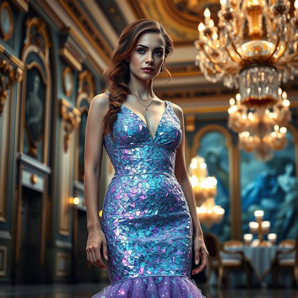 This image shows a woman standing in a grand ballroom, wearing a stunning, iridescent mermaid skirt dress crafted from crystal geodes. Her hair is styled in a sleek braid, and she wears matching crystal jewelry, evoking the drama and elegance of a Baroque painting with hyperrealistic precision.