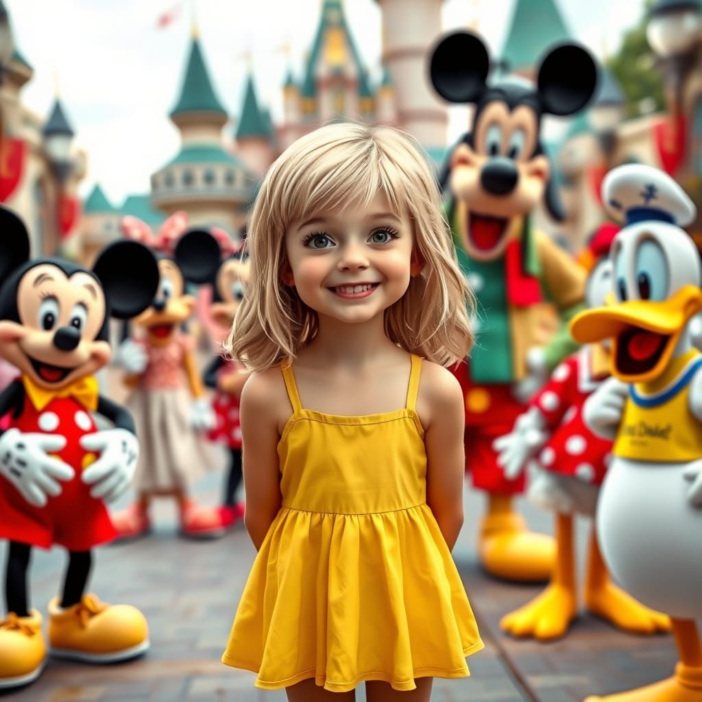 This image shows a vibrant and lively scene of a young girl surrounded by beloved Disney characters in the iconic Disneyland setting, captured in a photorealistic style with intricate details and warm colors.